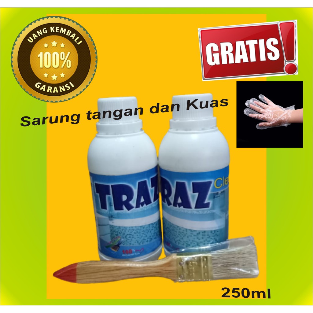 TRAZ Cleaner 250 mlmerupakan cairan pembersih porselen & keramik ekstra kuat yang terbuat dari bahan-bahan aktif berstandar internasional dan terbukti sangat efektif untuk mengupas dan membersihkan kerak air yang telah menempel dan mengendap pada keramik dan porselen selama bertahun-tahun dengan sangat mudah dan sangat cepat.Keunggulan TRAZ Pembersih Porselen & Keramik :*Tidak mengandung HCl*Tidak merusak keramik dan nat (sambungan keramik)*Tidak merusak warna porselen/keramik*Bisa digunakan untuk keramik putih, berwarna maupun bertexture*Tidak perlu disikat, hanya perlu dikuas*Tidak perlu menunggu (tuang, langsung dikuas)*Lebih efektif dan efisien. Sangat menghemat tenaga dan waktu anda*Dapat digunakan untuk semua jenis & warna keramik*COCOK untuk porselen, keramik, stainless & plastik*Tidak cocok untuk granit, ubin, marmer, dan teraso.*Perhatikan dan ikuti petunjuk pemakaian!TAKARAN YANG DISARANKANKerak ringan 1:3Kerak sedang 1:2Kerak berat 1:1 atau tanpa dicampur airUntuk perawatan, gunakan cairan TRAZ yang dicampur air dengan perbandingan 1:5#Pembersih kamar mandi #penghilang karat #penghilang noda karat #pembersih lantai kamar