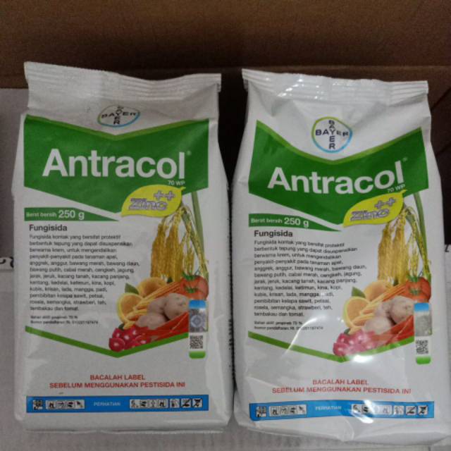 Spesifikasi Antracol 70WP Kemasan RepackMerk dagang : Antracol 70WPJenis : FungisidaBahan aktif : Propinep 70%Formulasi : WP (Wattable Powder)Warna : Krem/putih kekuninganCara kerja : KontakBentuk fisik : TepungProdusen : PT. Bayer IndonesiaDosis & Cara Penggunaan:1. Dosis disesuaikan dgn usia tanaman & jenis tanaman, lihat pd kemasan2. Fungisida Antracol 70WP dilarutkan dgn air, diaduk hingga produk tercampur rata3. Gunakan sprayer utk menyemprotkan larutan fungisida ketanaman4. Tambahkan perekat, pembasah & perata jika diperlukan5. Supaya lbh efektif sebaiknya penyemprotan dilakukan sejak dini6. Penyemprotan sebaiknya dilakukan pd pagi hari & sore hariKelebihan Fungisida Antracol 70WP1. Fungisida bekerja secara kontak langsung yaitu fungisida akan langsung bekerja ketika larutanyg disemprotkan bersentuhan dgn tanaman yg terinfeksi2. Antracol 70WP berbentuk tepung dpt disuspensikan dgn air & larut dgn segera sehinggapenggunaannya lbh mudah & praktis3. Dpt digunakan pd segala musim, baik musim kemarau maupun musim hujan4. Dpt digunakan utk mengendalikan penyakit jamur pd banyak jenis tanaman5. Fungisida Antracol 70WP bersifat racun kontak& tdk dpt menembus jaringan tanaman sehinggaresidu lbh rendahReady stock ya...Happy sho