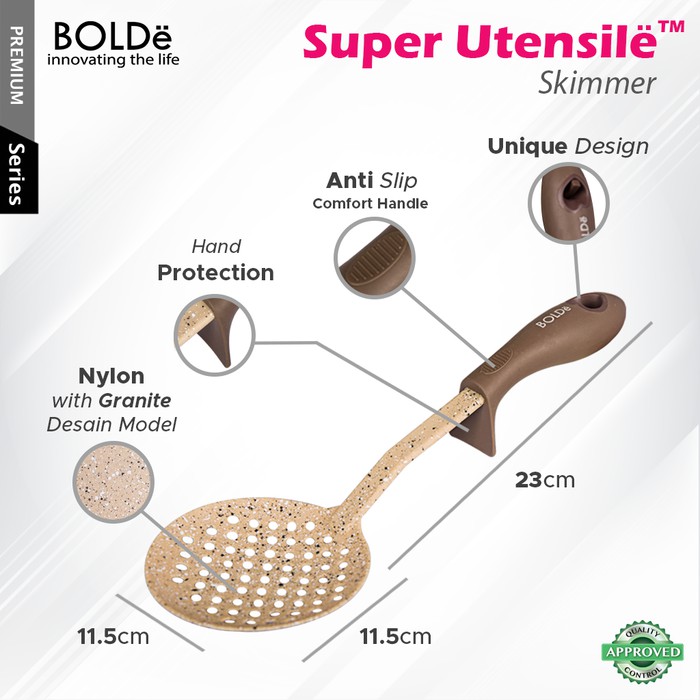 BOLDe Super Utensil SkimmerBOLDe kini hadir dengan peralatan memasak BOLDe Super Utensil, di rancang khusus dengan granite model berwarna beige yang elegan. untuk kenyamanan memasak anda. BOLDe Super Utensil menggunakan Nylon Material dengan Premium Quality Grade yang sangat nyaman digunakan untuk aktivitas memasak anda. Fitur Superb Heat Resistance yang ada di BOLDe Super Utensil ini tahan panas hingga 120 derajat celsius. Bagian gagang handle dirancang khusus untuk melindungi jari tangan anda supaya tidak terkena wajan yang panas saat digunakan serta nyaman saat digenggam. Bagian gagang handle BOLDe Super Utensil juga dilengkapi dengan lubang penggantung berbentuk unik, yang memudahkan anda menyimpannya sehingga dapur anda akan terlihat rapih.-FDA Approved-Food Grade-Premium Quality-Elegant Design with Granite Model-Nylon Material-Superb Heat Ressistances-Dangan Premium Nylon Material, BOLDe Super Utensil sangat cocok digunakan dengan produk BOLDe Super Pan dan peralatan masak berlapis Coating lainn