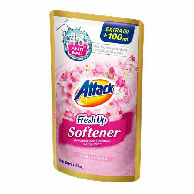 Attack Fresh Up Softener Sakura Blossom 800 ml + 100 ml adalah pewangi dan pelembut konsentrat dengan Teknologi Jepang, memiliki Anti Kuman yang melindungi dari pertumbuhan kuman penyebab bau.Nikmati sensasi wangi segar Attack Fresh Up yang tersedia dalam 2 varian wangi: Sakura Blossom dan Dazzling Lilac. Shelf life 15