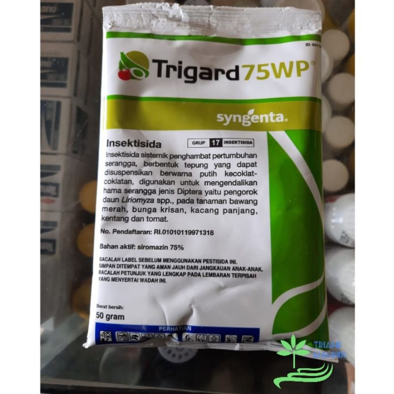 TRIGARD 75 WP Kemasan 50 grsiromazin : 75 %Insektisida racun kontak penghambat perkembangan khitin berbentuk tepung yang dapat disuspensikan. PT Syngenta Indonesia Izin: Tetap08 August 2021RI. 01010119971318Bawang Merah : pengorok daun Liriomyza sp. (Penyemprotan volume tinggi : 0,3 - 0,6 g/l)Kacang panjang : pengorok daun Liriomyza sp., kutu daun Aphid craccifora, penggerek polong Maruca testulalis (Penyemprotan volume tinggi : 0,15 - 0,3 g/l)Kentang : pengorok daun Liriomyza huidobrensis (Penyemprotan volume tinggi : 0,15 - 0,3 g/l)Krisan : pengorok daun Liriomyza chrysanthemi (Penyemprotan volume tinggi : 0,15 - 0,3 g/l)Tomat : pengorok daun Liriomyza huidobrensis (Penyemprotan volume tinggi : 60 g/100 l)Cara Pengaplikasian :1.larutkan 1 sendok teh atau 5 Gram untuk satu tangki sekitar 15 Liter. Dosis bisa disesuaikan dengan kebutuhan.2.Semprotkan pada tanaman secara merata.3. Ulangi 3 hari sekali atau sesuaikan dengan tingkat seranganDosis pakai5 gr per 16 liter air/per t