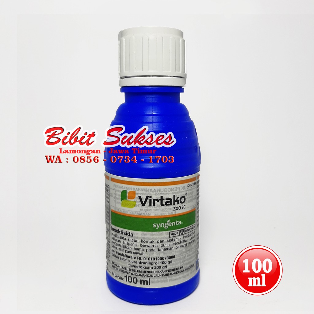 Insektisida VIRTAKO 300SC Kemasan 100ml Pembasmi Hama Ulat & WerengGolongan : InsektisidaCacara kerja : Kotak & SistemikUntuk tanaman : Padi dan SayuranHama sasaran : Wereng Coklat, Ulat Grayak dan Penggerek BatangPenyemprotan :Rekomendasi Waktu : Pagi hari atau sore hari.Rekomendasi Dosis : 0,2 ml – 0,5 ml atau 3 ml – 7 ml per tengki 14 liter.Rekomendasi Lainya :• Campurkan dengan perekat dan perata agar obat tercampur dengan air lebih merata dan tidak luntur saat terkena hujan.• Pencegahan / serangan tidak parah semprot 1x dalam 710 hari.• Serangan parah 2x dalam 7 hariBahan aktif :• Klorantraniliprol 100 g/l• Tiamektosan 200 /lIsi bersih• 10