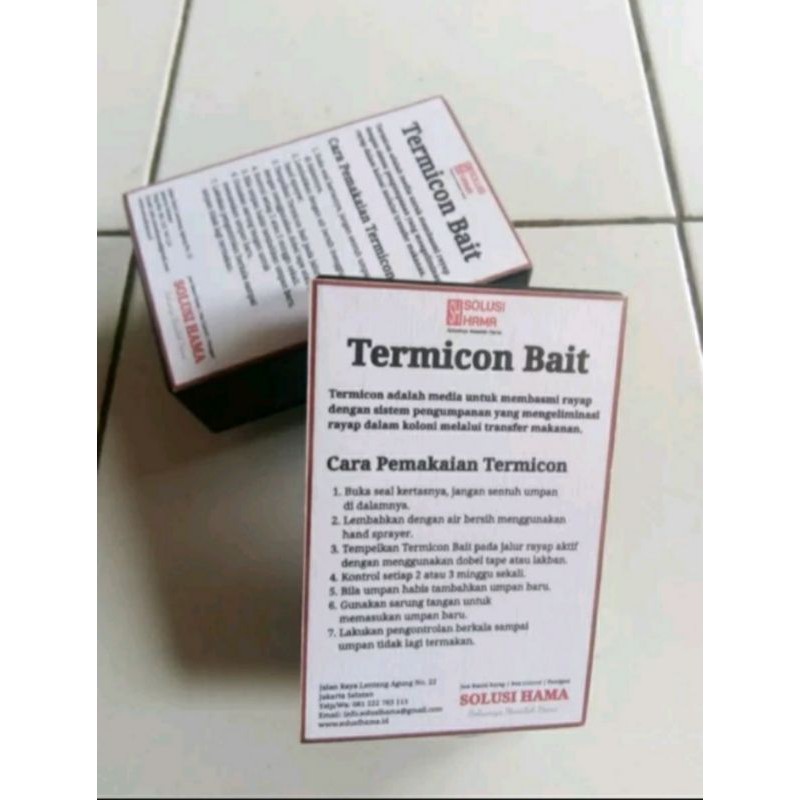 Termicon Bait adalah media untuk membasmi rayap dengan sistem pengumpanan yang mengeliminasi rayap dalam koloni melalui transfer makanan.Penggunaan yang mudah dan tidak perlu melubangi struktur bangunan, hanya tinggal membuka cover dan melembabkan tissue umpan di dalamnya lalu ditempelkan pada alur rayap agar mempercepat proses pengumpanannya.Sudah termasuk 4 roll tissue umpan di dalamnya yang sudah diberi hormon untuk memperlambat pertumbuhan populasi rayap sehingga sedikit demi sedikit koloni rayap akan h