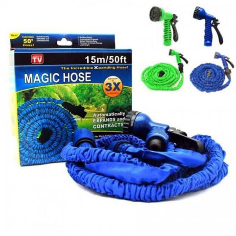 SELANG AIR AJAIB15-30METER 79.000Selang Air Ajaib Magic Hose yang bisa memanjang ( expand ) dan memendek ( shrink) tergantung isi didalamnya. Selang air ajaib Magic Hose ini juga di lengkapi dengan Sprayer yang memiliki 7 pola nozzle sprayer. Konsep Magic Hose / Expandable Hose / Xhose ini sebenarnya sederhana, yaitu surgical tubing dengan diameter besar yang mengembang akibat kontraksi karena adanya tekanan hidrolik dari air.Karaketer Selang Air Ajaib Magic Garden Expand HoseMagic Hose Dapat memanjang otomatis hingga 3 kali dari ukuran normalSelang secara otomatis berkontraksi ketika air di hentikan / dimatikanSelang Magic Hose ini sangat ringan dan kuatTidak akan pernah menjadi kusutPanjang normal ( sebelum memanjang) sekitar 2.5 M bisa memanjang hingga 22.5mDiameter selang bagian dalam 6MM dan diameter luar 9MM.Konektor selang air ini adalah terdiri dari Konektor Female dan konektor male, dilengkapi 1 piece valve (tuas) mematikan yang mudah disambungkan.Nozzle Sprayer memiliki 7 fungsi semprotan berbeda yaitu : Jet, Shower, Flat, Cone, Soaker, Mist danCenterBahan selang air ajaib ini adalah high density polymer untuk bagian dalam dan polyester pada bagian luar selang.Tips Perawatan Selang ajaib Magic HoseKeringkan isinya setelah digunakanSelang air ajaib ini janga dibiarkan terlalu lama terpanggang sinar matahari, karena lambat laun mengurangi elastisitas surgical tubing.Jangan di seret di area yang banyak duri.Hati-hati dalam penyambungan konektornyaMagic Hose Dapat Anda Gunakan untukMenyiram tanaman taman andaMencuci / membersihkan / membilas mobil,Membersihkan perkarangan, rumah dan bagian lain dari rumah andaDan masih banyak keperluan lai