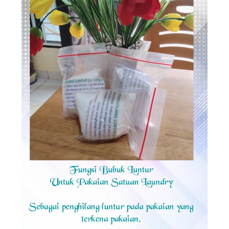 Sebagai penghilang luntur pada pakaian yang terkena lunturan.Rebus 1/4 bks dalam 2 liter air dan celup kain yang terkena lunturan kedalam larutan selama 20 menit.Bila ada masalah/ kendala pada pesanan anda, terutama dipengangkutan harap diskusikan terlebih dahulu ke kami untuk mendapatkan solusi yang saling menyenangkan.jangan lupa intip produk - produk lain ditoko kami jangan lupa follow toko kami dan klaim voucher untuk mendapatkan harga yang makin bikin senyum jangan lupa memberikan bintang 5 dan memberikan komentar yang positif.Terimaksih telah berbelanja ditoko kami. pembelian anda akan kami perhatikan sebaik - baiknya. '' pelayanan sepenuh hati dan terbaik untuk anda adalah tujuan kami ''.#BubukLuntur #detergentpenghilangluntur #la