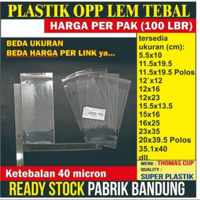 Plastik OPP TEBAL (40 micron) dengan LEM (Seal SUPER KING)Sisi Las DOUBLE SEAL (Las Jahit / Gazette Edge ...lebih kuat ga gampang robek ).. lebih EKONOMIS ! (Untuk yang ukurannya besar)[TANYAKAN BARANG READY/TIDAK SBLM PESAN) ***Kualitas PREMIUM langsung dari PABRIK***KENAPA PILIH THOMAS CUP OPP ?Kami adalah pabrik penyuplai plastik opp TERBAIK di Jawa Barat, langganan tetap kami adalah pembuat baju & undangan ternama di kota Bandung & JKT, ukuran dijamin pas & presisi !Plastik OPP yg sering disebut plastik kaca ini bisa dipakai sebagai bungkus eksklusif yang dapat memberikan NILAI TAMBAH bagi produk anda antara lain :- Baju / Kaos : uk. 28.1 x 35 , 30.1 x 37.5- Jaket / Kemeja : uk. 30.1 x 40- Kerudung / Baju Anak : uk. 16 x 25 , 20 x 30- Souvenir : uk. 5.5 x 10 , 11.5 x 19.5- Roti : uk. 13 x 14 , 15 x 16, 12 x 16 , 12 x 23- plastik masker- Kaos Kaki, Undangan, Blangko, Peci,dll1 pack isi 100 lembar, Pembelian 100 pack Discount 5%Beda ukuran beda harga ya , silahkan cek etalaseBisa buat ukuran CUSTOM (disesuaikan dgn ukuran produk anda, yesss bisa gaess karena kami pabrik jadi bisa ... minimal pesan 50 pak yaa) - tp tanyakan dlu siapa tahu ada barangnyaMau cek barang dan ukuran juga bisa beli langsung ke toko OFFLINE di Jalan Kalipah Apo 66 - Kota BandungKeterangan lebih lanjut CALL / WA 087828138116 (Toko THOMAS K