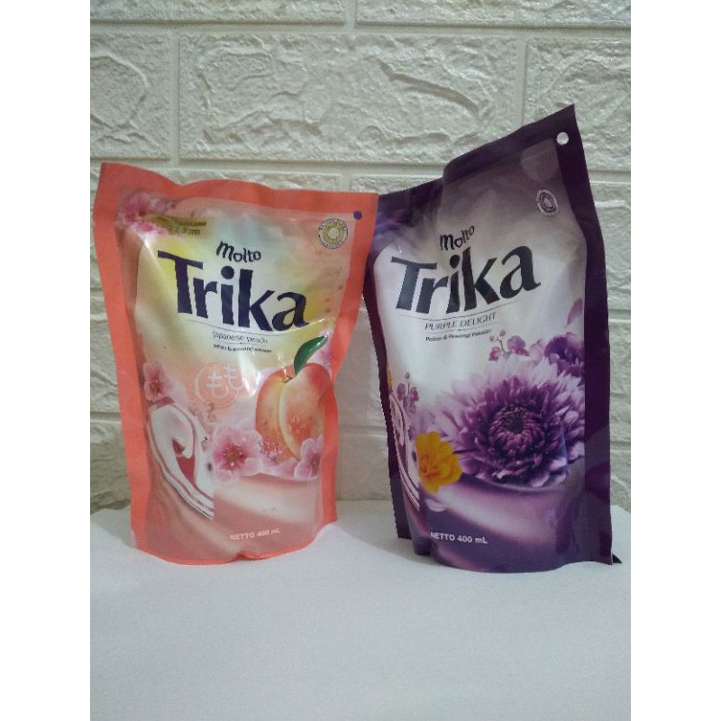 Molto Trika melembutkan lipatan sekaligus melindungi setrika Anda dari kerak.Pengharum dan pelicin pakaian dengan sentuhan keharuman dari perpaduan herbal, lavender, dan melati yang memberi keharuman segar dan membuat pakaian mudah disetrika.Keunggulan lainnya:Wangi yang harum dan segarMudah diset